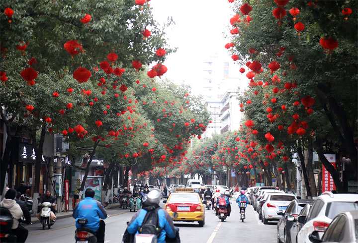 今年除了火紅的燈籠外,此次春節(jié)氛圍營造設(shè)計比去年增加了福字文化元素,順應(yīng)了習近平總書記的新春祝福語中的“和順致祥 幸福美滿”祝福。同時,依舊延續(xù)了國慶氛圍營造的“晝夜結(jié)合”的特點,安裝了LED燈籠,讓夜晚的城市變得更加璀璨迷人。