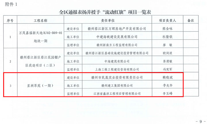 3月2日上午,贛州蓉江新區(qū)表彰通報2021年贛州蓉江新區(qū)建筑施工安全“流動紅旗”競賽暨安全生產(chǎn)大比武活動開展情況,其中,星洲萃苑(一期)項目在此次評比中喜獲“流動紅旗”,并獲得贛州蓉江新區(qū)安委會發(fā)放的經(jīng)濟獎勵12000元整。