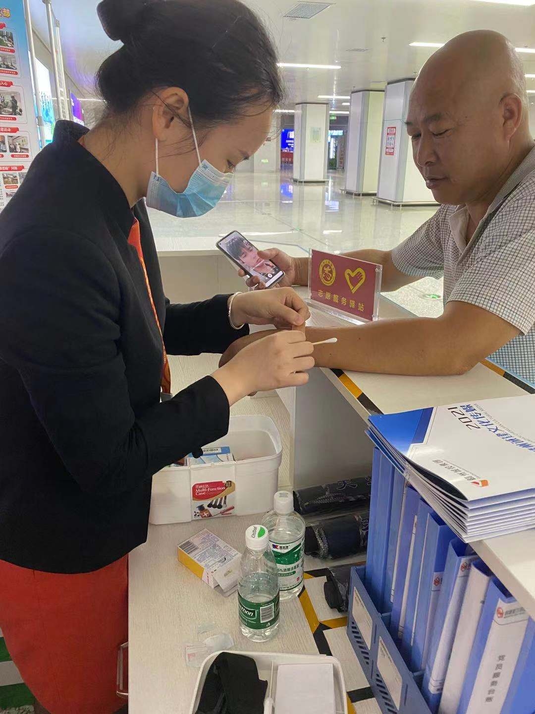 6月6日,一位男士來到贛州西站黨員服務窗口詢問是否有創(chuàng)可貼,經(jīng)了解,該旅客手部因不慎刮傷流血不止,值班人員察看傷口后,迅速先幫旅客采取酒精消毒,再熟練地用創(chuàng)可貼包扎好傷口。該男士連聲道謝,露出了滿意的笑容。