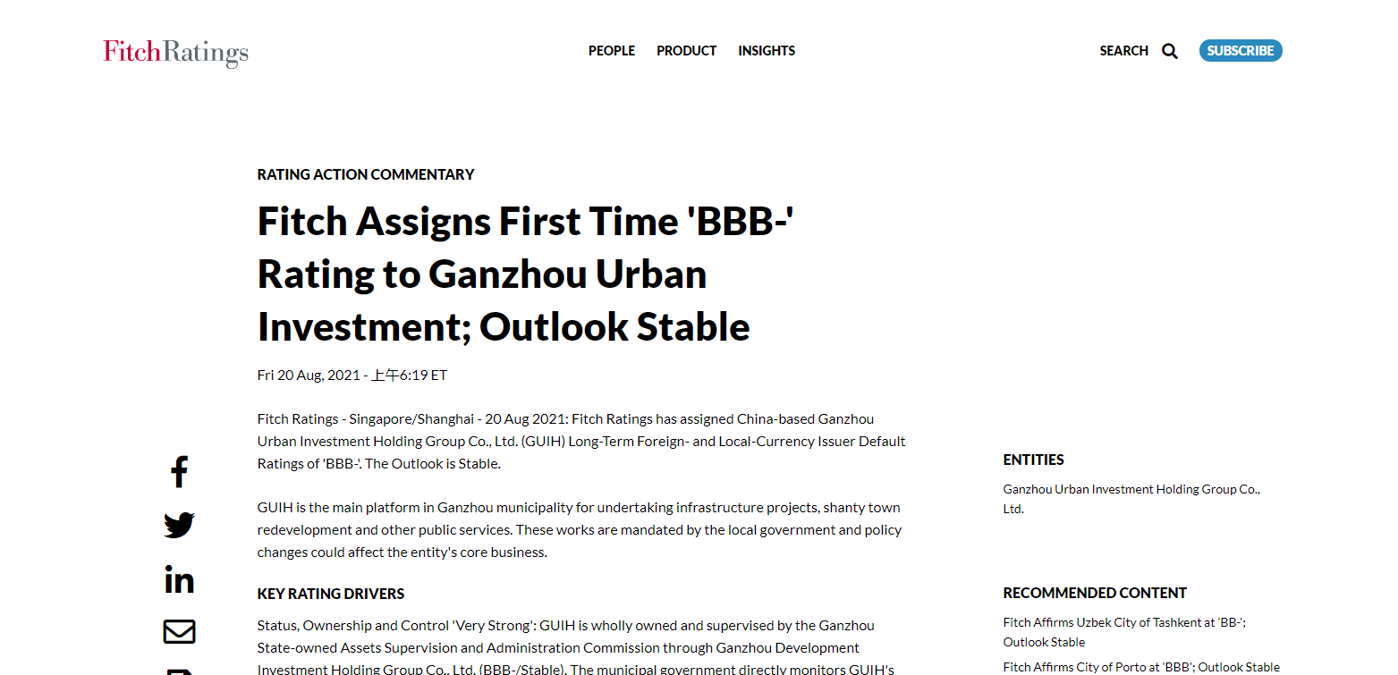 “穩(wěn)定”。由此,贛州城投集團國際信用開啟了投資級新篇章。此次投資級國際信用評級的獲得,再一次證明了贛州城投集團行業(yè)地位和雄厚實力,初步體現(xiàn)了境外資本市場對贛州城投集團影響力的高度認可,為贛州城投集團開展外資引進工作夯實了牢固基礎(chǔ)。
