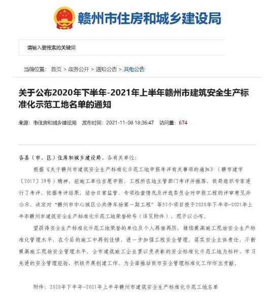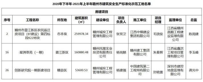 日前,贛州市住房和城鄉(xiāng)建設(shè)局公布了2020年下半年-2021年上半年贛州市建筑安全生產(chǎn)標(biāo)準(zhǔn)化示范工地名單,由贛州城投集團(tuán)建設(shè)的贛州市章江新區(qū)農(nóng)民返遷房項目(BT建設(shè))第四標(biāo)段K22地塊、星洲萃苑(一期)、中科院贛江創(chuàng)新研究院一期新建項目共3個項目獲獎。