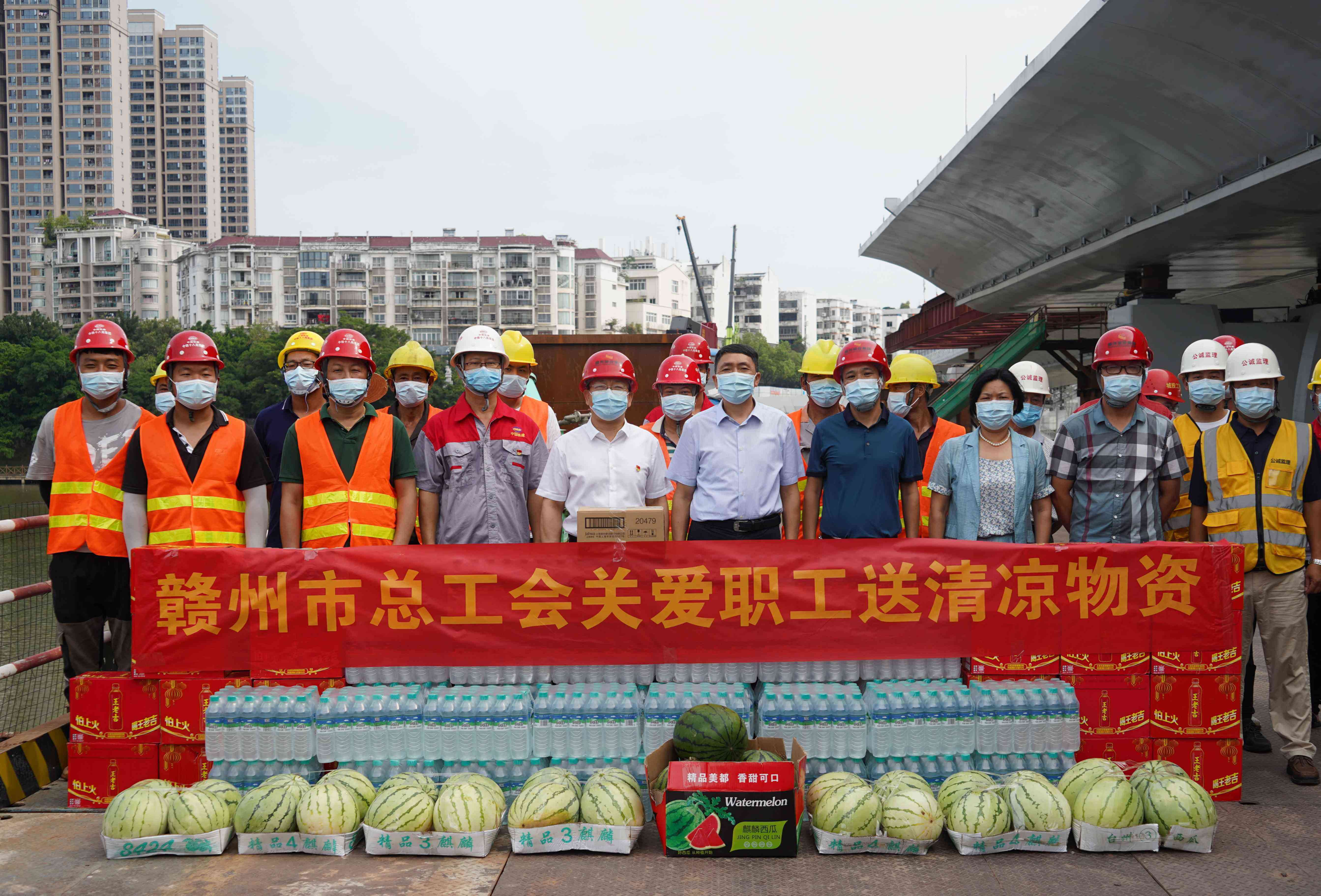 為鞏固解困脫困工作成果,提高職工生活品質(zhì),使高溫下作業(yè)的一線職工有更多的獲得感、幸福感、安全感,8月25日,贛州市總工會(huì)二級(jí)調(diào)研員賴定銘一行來到贛州城投集團(tuán)南河大橋拓寬改造(二期)工程項(xiàng)目工地開展“關(guān)愛職工 夏送清涼”走訪慰問活動(dòng),送上市總工會(huì)的關(guān)懷。贛州城投集團(tuán)黨委副書記黃家偉,工程管理公司相關(guān)負(fù)責(zé)人,集團(tuán)工會(huì)、文化宣傳部、項(xiàng)目部業(yè)主、監(jiān)理和施工單位相關(guān)人員等參加慰問。