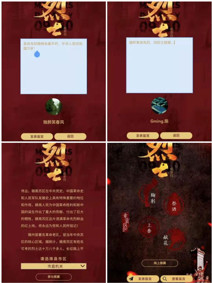 在第八個“烈士紀念日”之際,贛南日報推出了網上祭奠活動。集團積極響應,認真組織集團18個黨支部(黨總支)250余名黨員在辦公室、項目工地、公園廣場、高鐵西站等地現場用手機或電腦,進入贛南日報推出的網絡祭奠平臺,為身邊贛南籍的革命英雄烈士在線鞠躬、祭酒、獻花、上香、留言等形式網上祭奠250余人次,深切緬懷革命先烈,引導黨員感恩前進,牢記使命,大力傳承好紅色基因。